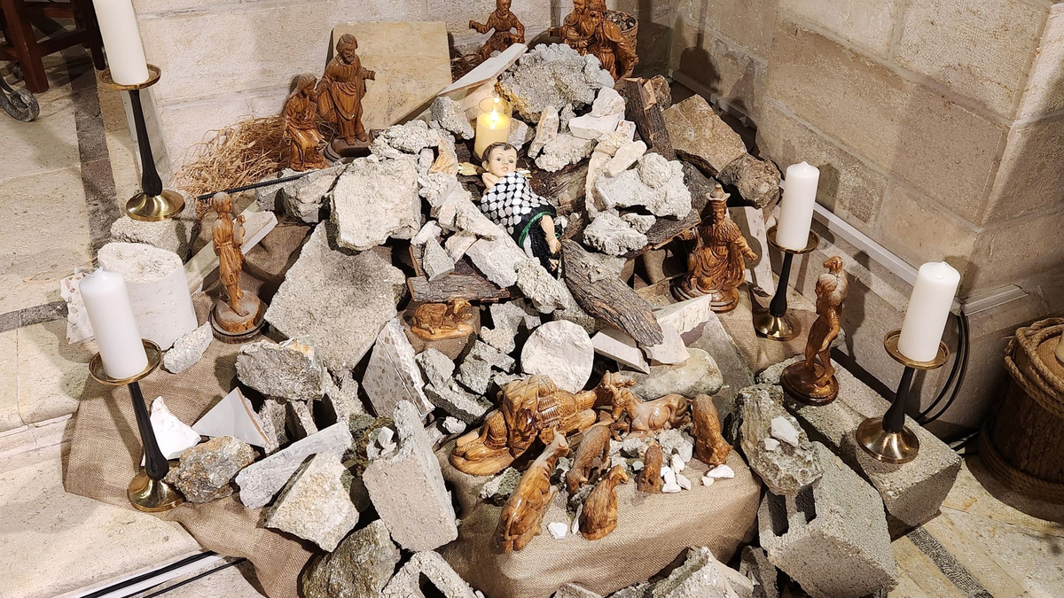 12.12.2023 - 11:22:59 | dpa.deNeben dem Altar liegt ein Haufen Steine, darum herum Holzfiguren. In der Mitte liegt eine Puppe eingehüllt in einen schwarz-weißen Palästinenserschal, wie Fotos zeigen. Angehörige der evangelisch-lutherischen Weihnachtskirche in Bethlehem wollten an die unter Trümmern verschütteten Kinder im Gazastreifen erinnern, sagt Pfarrer Munther Issak. «Die Idee ist, dass Christus geboren ist unter den Unterdrückten und denen, die heute leiden.» Die Installation ersetze in diesem Jahr den Weihnachtsbaum.
