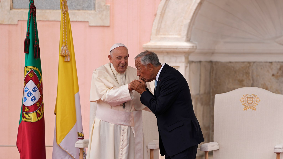 Nach seiner Ankunft hat sich Franziskus mit dem portugiesischen Staatspräsidenten Marcelo Rebelo de Sousa zur offiziellen Willkommenszeremonie im Amtssitz Palácio Nacional de Belém getroffen. Der Pontifex überreichte Rebelo de Sousa sein Gastgeschenk und sie unterhielten sich.