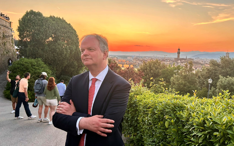 Das ist natürlich der Traum eines jeden Wahlkämpfers. Kaum dass Eike Schmidt auf der Piazzale Michelangelo angekommen ist, dem Aussichtspunkt hoch über Florenz, brandet Applaus auf. Ein freudiger Blick zu den Leuten oben auf der Mauer. Bis der Kandidat fürs Bürgermeisteramt feststellen muss, dass der spontane Beifall jemand anderem gilt: der Sonne, die heute wieder einmal besonders spektakulär hinter den Dächern der toskanischen Hauptstadt versinkt. Bei solch außerirdischer Konkurrenz nimmt von ihm niemand Notiz.