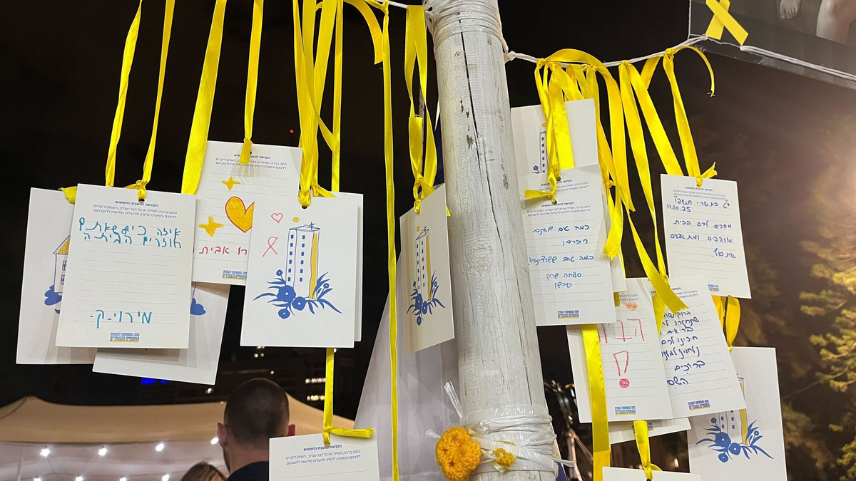 Auf dem Platz der Geiseln hängen an gelben Bändern Hunderte von Briefen, die Bürger den Geiseln geschrieben haben. «Was für eine Freude, dass Ihr wieder nach Hause kommt», steht in krakeliger Kinderschrift in einem davon.