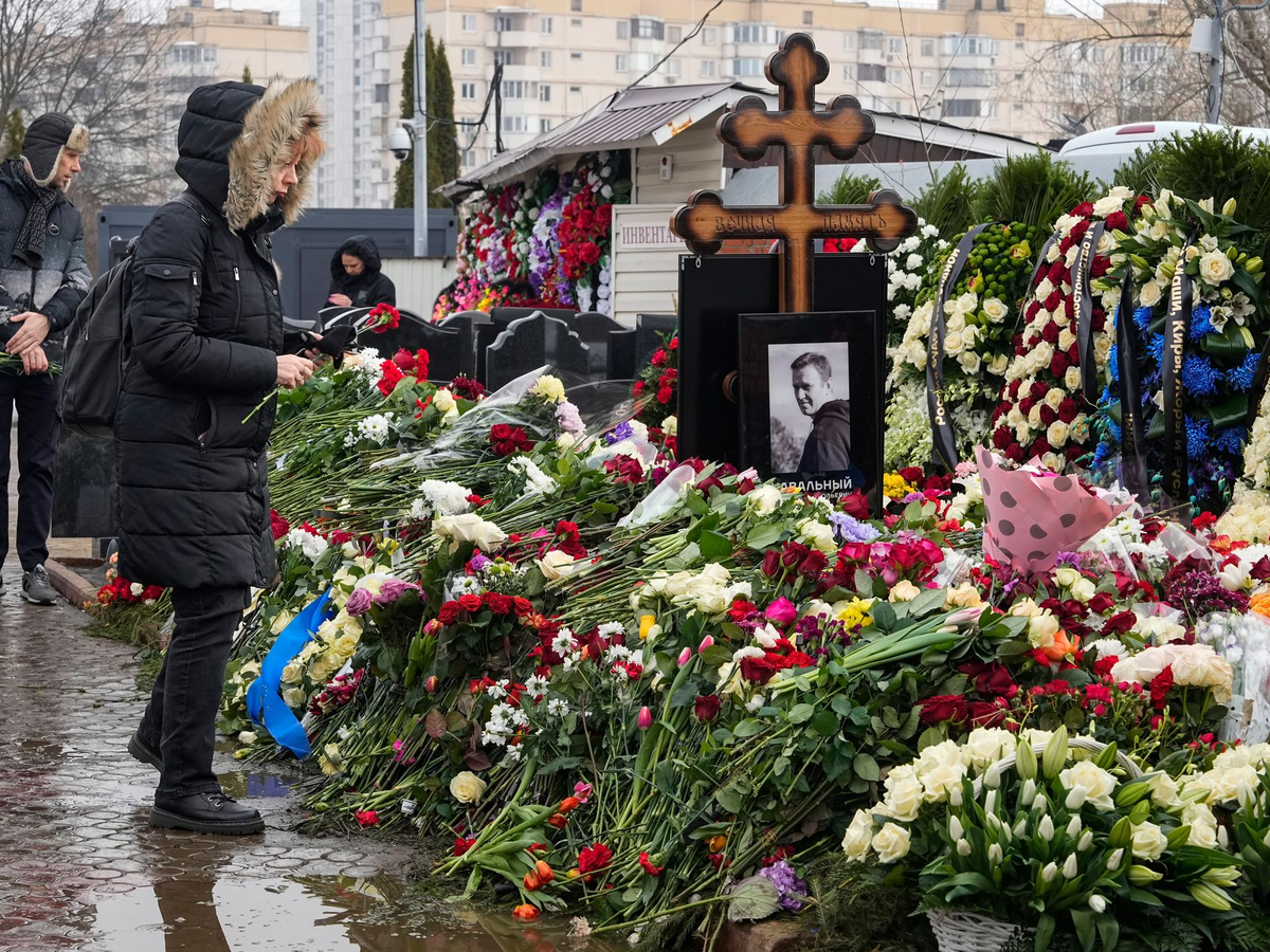 Am Borissowskoje-Friedhof in Moskau, wo Nawalnys Grab ist, können Menschen Blumen niederlegen. Kundgebungen in Russland sind verboten.