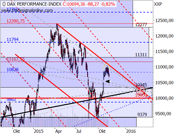 Der DAX hat nach wie vor seine Abwärtstrendlinie (obere dicke rote Linie im folgenden Chart) nicht überwinden können. Stattdessen sieht es immer mehr danach aus, dass er von dieser abprallen wird. Dazu noch einmal der DAX-Chart nach der Target-Trend-Methode: