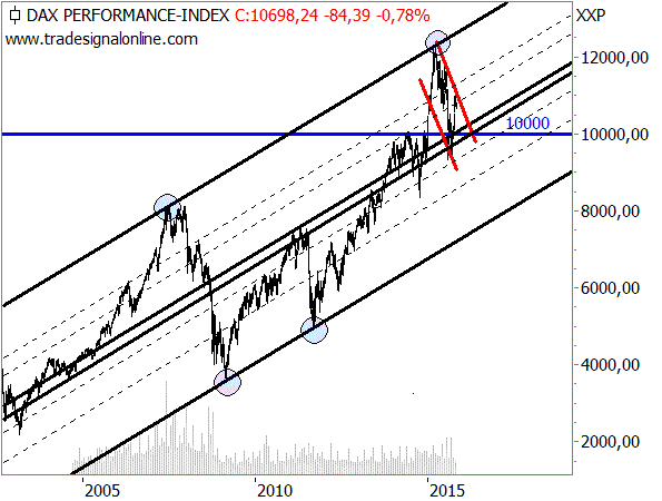 Weniger klar ist, ob der DAX sich nun über der 10.000er Marke fängt und weiter steigt oder zum Beispiel entlang der 10.000er Marke seitwärts notiert. Aber selbst ein Rückfall auf die untere Linie und damit in den Bereich der 8.000-Punkte-Marke wäre noch bullish zu werten. Auf diesem Niveau würden sich dann für langfristige Investoren höchst interessante Einstiegssignale ergeben, die man vergleichsweise dicht absichern könnte.