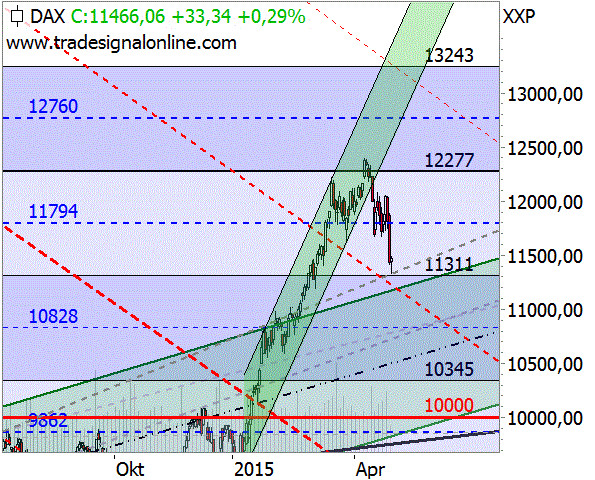 Sie erinnern sich. Ich hatte geschrieben, dass die nächste wichtige Marke die untere Rechteckkante bei 11.311 Punkten ist. Erst wenn der DAX diese Marke nach unten bricht, wäre dies ein erstes bearishes Signal. Gestern hat der DAX ein Tief 20 Punkte oberhalb dieser Linie ausgebildet. Hier verläuft eine Trendlinie (grau gestrichelt) die ebenfalls als Unterstützung fungierte. Das zeigt wieder einmal, wie gut die Target-Trend-Methode funktioniert.