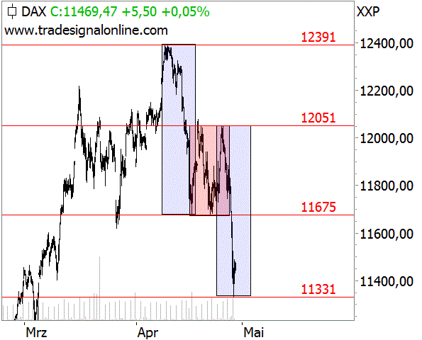 Zunächst kam es vom Hoch bei 12.391 Punkten zu einem Abverkauf von 716 Zählern bis an die 11.675er Marke (linkes blaues Rechteck). Dem folgte eine seitwärts gerichtete Konsolidierung (rotes Rechteck). Anschließend kam es vom Zwischenhoch bei 12.051 Punkten zu einem Kursrutsch bis 11.331 Punkten (720) Punkten. Diese zwei nahezu gleich großen, von einer Konsolidierung unterbrochenen Kursrückgänge sind das typische Konsolidierungsmuster - das auch dieses Mal perfekt gepasst hat.