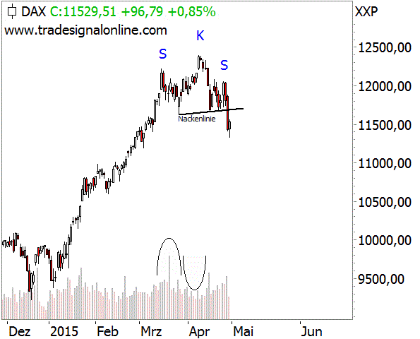 Es wird auch wieder diskutiert, ob im DAX eine Schulter-Kopf-Schulter-Formation (SKS) entstanden ist. Dies ist deswegen so wichtig, weil eine SKS eine Top-Formation darstellt. Eine solche erhöht die Wahrscheinlichkeit dafür, dass wir im DAX nun ein längerfristiges Top gesehen haben.