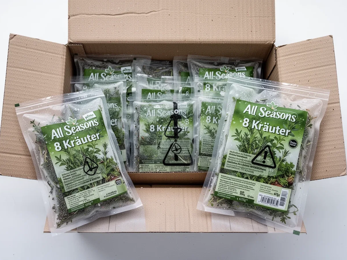 Vom Rückruf betroffen ist die 75-Gramm-Packung "All Seasons 8 Kräuter" mit den Mindesthaltbarkeitsdaten 05.12.2027, 08.12.2027 und 10.02.2028. Andere Chargen sind nicht betroffen. Aldi hat das Produkt bereits aus dem Sortiment genommen.