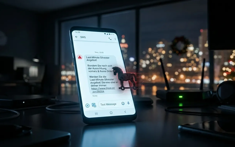 Der Link führt jedoch auf Phishing-Portale, die Bank-Login-Daten abgreifen. Zusätzlich imitieren Betrüger Benachrichtigungen von Paketdiensten und Online-Händlern. Typische Texte: “Ihr Silvester-Paket konnte nicht zugestellt werden” oder “Ihr Gutschein verfällt heute Nacht”.