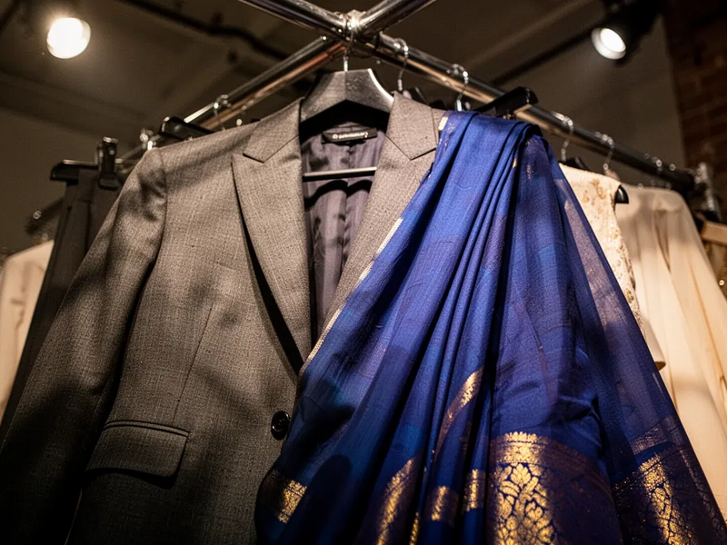 Statt leuchtender Farben dominierte eine tiefe Palette aus Holzkohle, Saphir und Bernstein. Gurung verband scharf geschnittene Anzüge, die an seine katholische Schuluniform erinnern, mit der fließenden Eleganz von Saris. Diese Gegenüberstellung schuf eine komplexe Erzählung – ein modernes Statement mit globaler Relevanz, das aus persönlicher Geschichte schöpft.