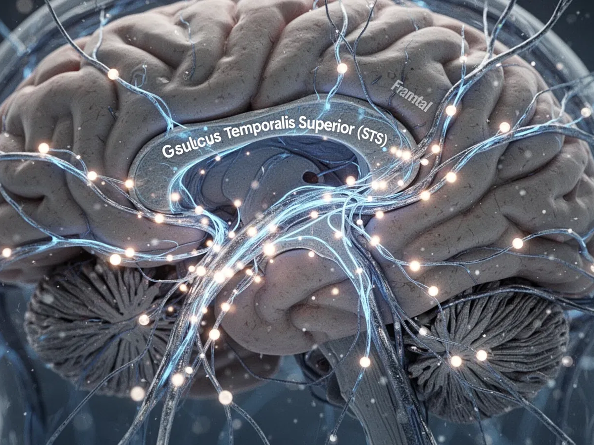 Im Zentrum steht der Sulcus temporalis superior (STS), eine Furche im Schläfenlappen. Diese Region feuert besonders stark, wenn wir beobachten, wohin eine andere Person schaut. Der STS verarbeitet nicht nur die Augenbewegung, sondern setzt sie auch in einen sozialen Kontext.