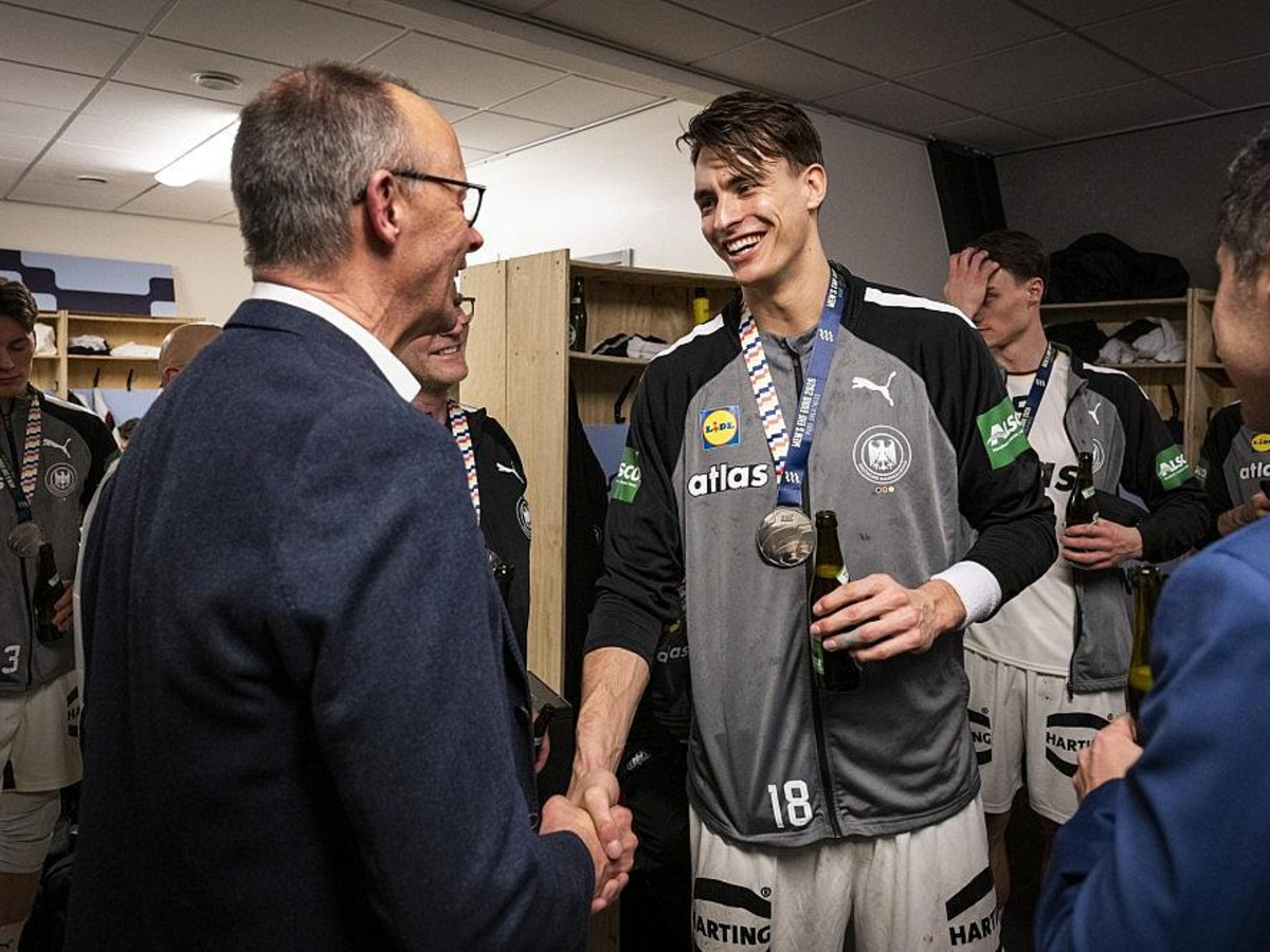 Merz gratuliert deutschen Handballern in der Kabine