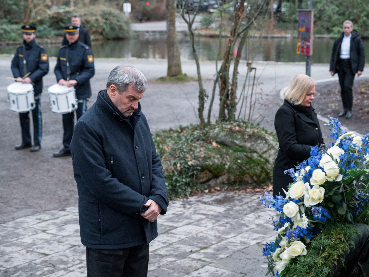 Auch Bundesinnenminister Nancy Faeser (SPD) und Bayerns Ministerpräsident Markus Söder (CSU) nahmen an der Trauerfeier teil. Zuvor hatten sie den Tatort besucht. In dem Park, in dem ein zweijähriger Junge und ein 41 Jahre alter Mann am Mittwoch erstochen wurden, legten sie Kränze nieder.