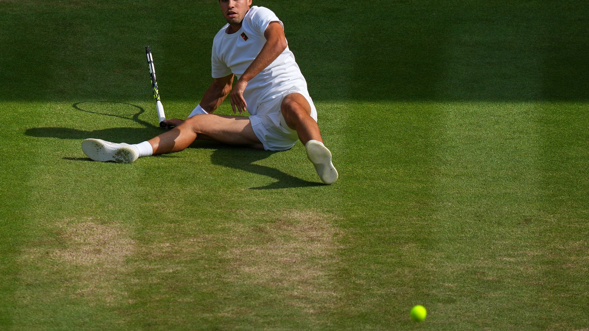 Gleich zweimal rutschte Sinner auf dem ausgetretenen Gras hinter der Grundlinie aus, ließ sich davon aber ebenso wenig aus dem Konzept bringen, wie beim Vorfall mit dem Champagnerkorken.