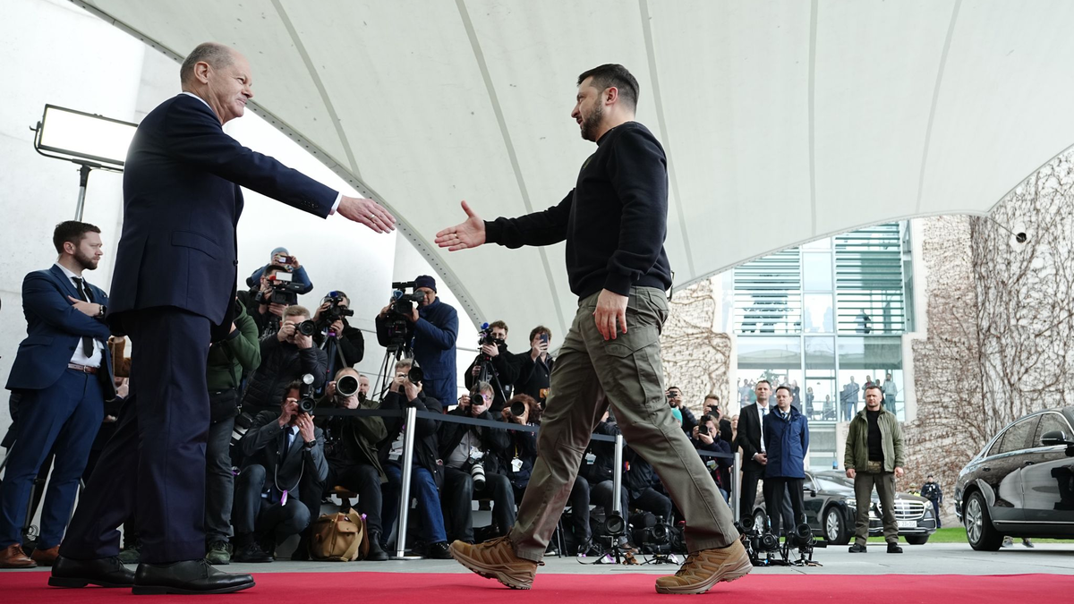 16.02.2024 - 11:43:15 | dpa.deDer ukrainische Präsident Wolodymyr Selenskyj ist für einen Besuch in Deutschland eingetroffen. Vor dem Berliner Kanzleramt wurde er von Bundeskanzler Olaf Scholz (SPD) begrüßt. Nach einem kurzen Händeschütteln für die Fotografen und Kameraleute zogen sich beide in die Regierungszentrale zurück.