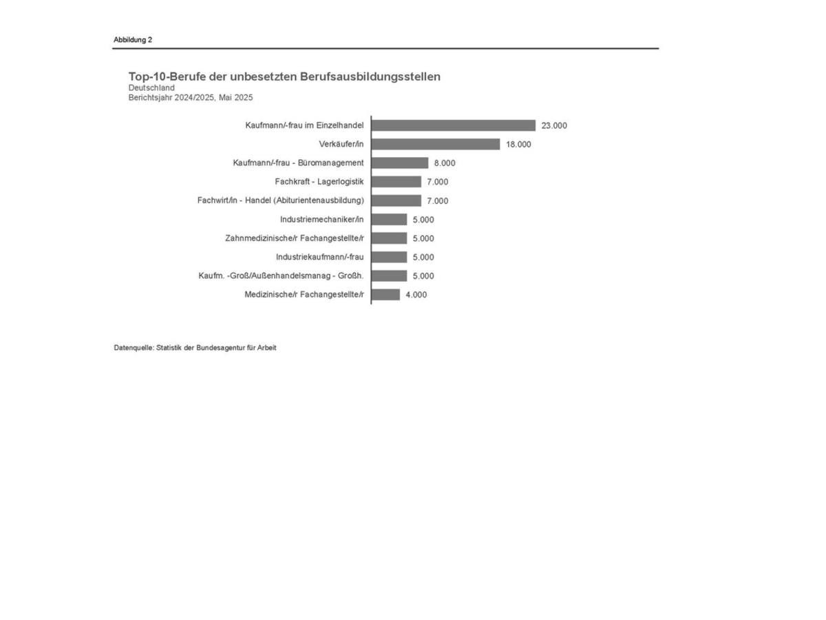 Gerade in Berufen, die nicht so viele Jugendliche im Fokus haben sind noch zahlreiche Ausbildungsstellen unbesetzt. Fast 42.000 unbesetzte Ausbildungsstellen gibt es in Verkaufsberufen (ohne Spezialisierung), 19.000 in Hoch-, Tief-, und Ausbauberufen, 16.000 in Mechatronik, Energie- und Elektrotechnikberufen, jeweils etwa 11.000 in Lagerlogistikberufen und Berufen in Lebensmittelherstellung und -verkauf. Auch in Metallberufen, Hotel- und Gaststättenberufen (inkl. Köche) und in Maschinenbau- und Betriebstechnikberufen sind noch viele Ausbildungsstellen frei.