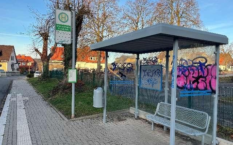 Betroffen war diesmal die Bushaltestelle an der St.-Laurentius-Straße / Schulstraße. Auf den der Polizei vorliegenden Fotos sind mehrere Schriftzüge in blauer, schwarzer und pinker Farbe zu erkennen, darunter "TREK", "161", "ZERO", "JORK", "BILDUNG", "1213" sowie "FCK NZS". Bereits in den vergangenen Wochen war es im Nahbereich zu ähnlichen Farbschmierereien gekommen.