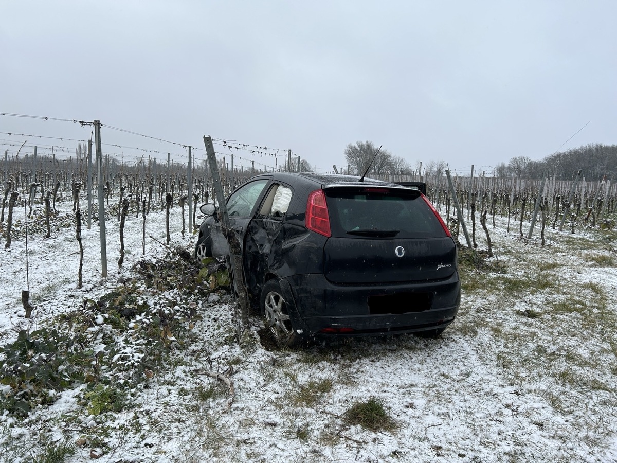 A65 - Am Sonntagmorgen (16.02.2025) gegen 08:15 Uhr kam eine Autofahrerin auf der A65 in Fahrtrichtung Landau zwischen der Anschlussstelle Neustadt-Süd und der Anschlussstelle Edenkoben bei winterlichen Verhältnissen von der Autobahn ab und blieb letztlich in einem nahegelegenen Wingert stehen. Im Rahmen der Verkehrsunfallaufnahme konnte festgestellt werden, dass an dem Fahrzeug der 22-jährigen Fahrerin lediglich Sommerreifen montiert waren. Diese Tatsache sowie die winterglatte Fahrbahn dürften hauptursächlich für den Verkehrsunfall gewesen sein. Die Fahrerin wurde nach aktuellem Stand leichtverletzt und zwecks Überprüfung in ein Krankenhaus verbracht. Am Pkw entstand vermutlich Totalschaden, sodass dieser durch ein Abschleppunternehmen geborgen werden musste. Es kam zudem zu einem Flurschaden, mehrere Wingertszeilen wurden ebenfalls beschädigt. Gegen die Fahrerin wird ein Bußgeldverfahren eingeleitet. Zu Verkehrsbeeinträchtigungen auf der A65 kam es aufgrund der neben der Fahrbahn liegenden Unfallörtlichkeit nicht.