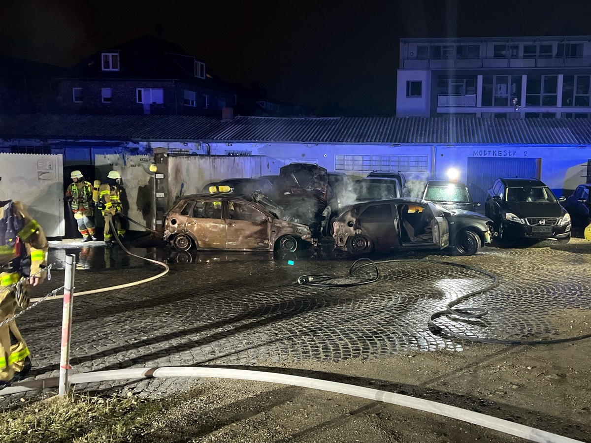 10.02.2025 - 10:20:15 | presseportal.deAlle Brände passierten in der Nacht von Samstag auf Sonntag (09.02.2025). Gegen 01:25 Uhr brannten drei Fahrzeuge auf dem Gelände eines Kfz-Handels an der Moltkestraße vollständig aus. Vier weitere Fahrzeuge wurden stark beschädigt. Auch das Dach einer Garage wurde in Mitleidenschaft gezogen. Wenige Minuten später (gegen 01:40 Uhr) brannte auf einem Parkplatz an der Benediktinerstraße/ Klausenerstraße ein Papiercontainer. Eine halbe Stunde später (gegen 02:10 Uhr) geriet Unrat an der Benediktinerstraße in Brand. Gegen 04:15 Uhr schließlich brannte erneut ein Müllcontainer: dieses Mal an der Junkerstraße.