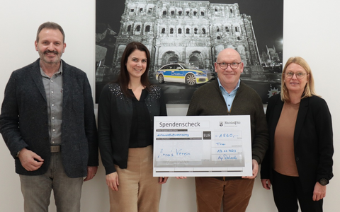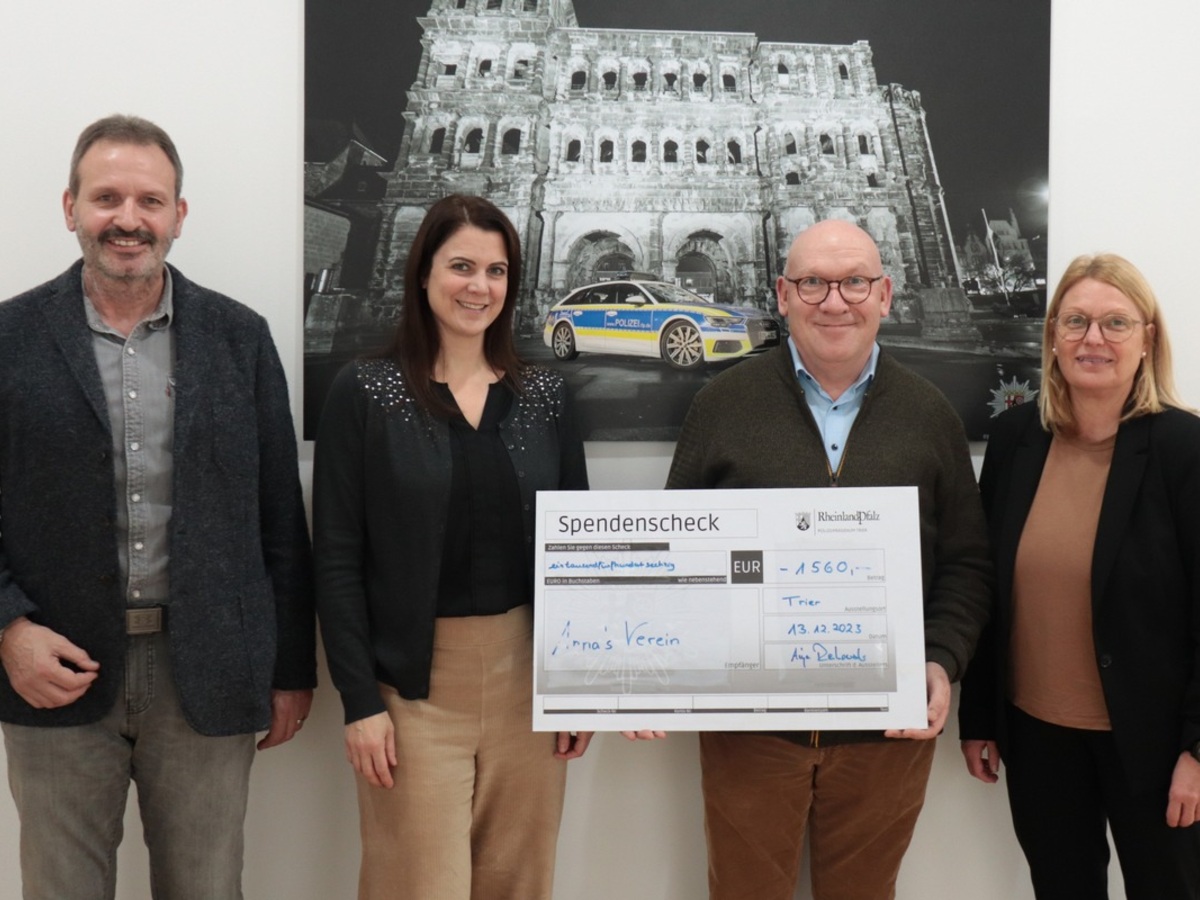 Die Hälfte der gesammelten Spenden, 1.560 EUR, kamen Annas Verein e.V. zu Gute. Der Verein setzt sich seit mehr als 20 Jahren für die Förderung von Einrichtungen zur Behandlung chronisch und krebskranker Kinder sowie zur Betreuung von Kindern krebskranker Eltern ein. Hermann Becker, Vorsitzender von Annas Verein e.V. und Vater von Anna, der Namensgeberin des Vereins, nahm die Spende am 13. Dezember persönlich im Polizeipräsidium Trier entgegen und bedankte sich für die finanzielle Unterstützung seines Herzensprojektes.