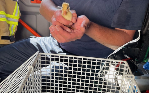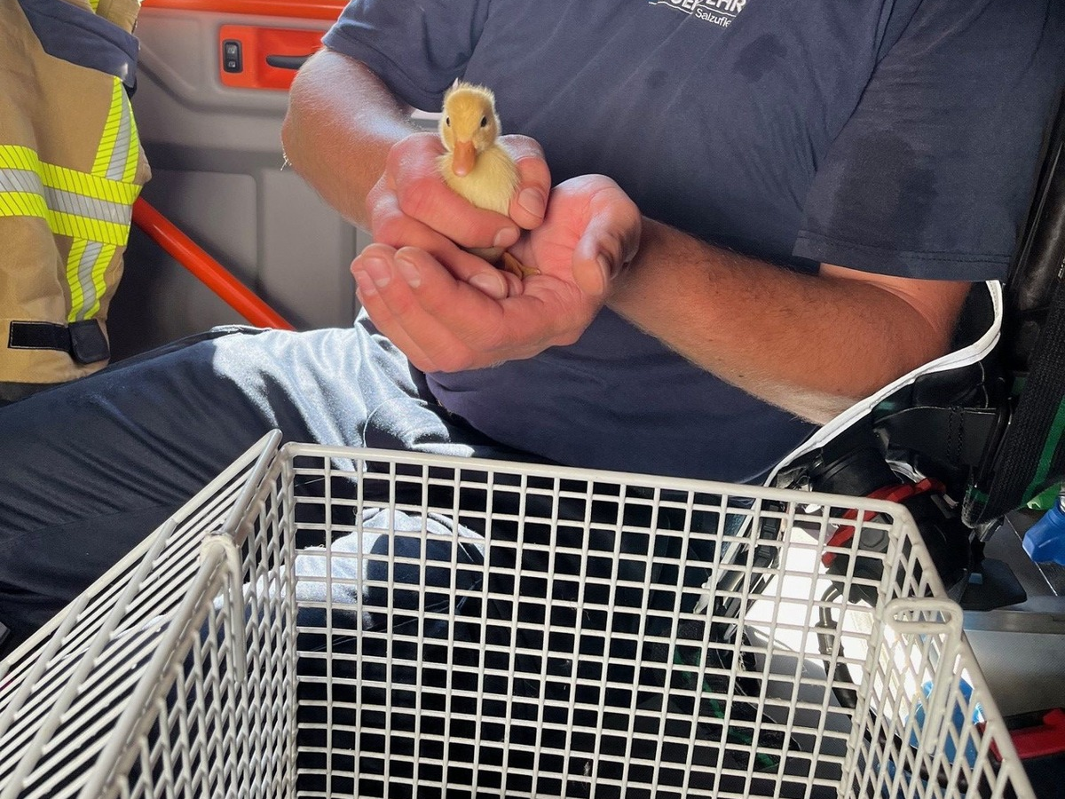 Bad Salzuflen - (dhob). Die hauptamtlichen Kräfte der Freiwilligen Feuerwehr Bad Salzuflen sind am Samstagnachmittag (11.05.2024) zu einem kuriosen Einsatz gerufen worden. Passanten hatten gegen kurz nach 16.00 Uhr an einer Brücke unweit der Millau-Promenade zwei Entenküken entdeckt. Die beiden versuchten auf der Salze schwimmend flussaufwärts hinter ihrer Mutter herzukommen. Nachdem das in mehreren Versuchen an den dortigen Wasserterrassen nicht klappte, informierten die Passanten die Rettungskräfte. Während sich zwei Feuerwehrleute auf die Suche nach dem Muttertier machten, probierte der Angriffstrupp sich den beiden Küken von der Flussseite aus zu nähern. Mit Gummistiefeln und Wathose begaben sie sich in die Salze hinein. Leider waren die Tiere zu scheu und versteckten sich im Gestrüpp hinter ein paar Ästen. Mit Hilfe eines Keschers und einem kurzen und beherzten Zugriffs konnten die Feuerwehrleute die jungen Enten eingefangen. Dadurch, dass die Suche nach der Mutterente ohne Erfolg blieb, brachten die Rettungskräfte die Tiere zu einer "Ersatzkükenmama". Nach rund 30 Minuten war der tierische Einsatz beendet. Am Ufer der Salze verfolgten einige Zuschauer das Treiben und fieberten mit den Feuerwehrleuten bis zum glücklichen Happy End mit.