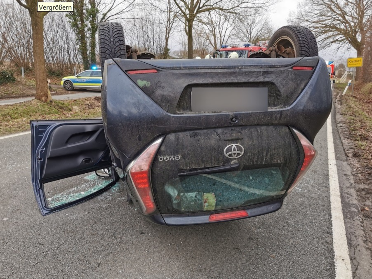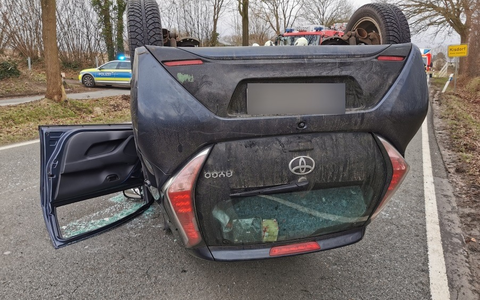 Im weiteren Verlauf überschlug sich der Personenkraftwagen und blieb auf dem Dach liegen. Der Kleintraktor kam im angrenzenden Graben zum Stehen.