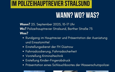 17.09.2025 - 08:30:00 | presseportal.deDie Polizei in Stralsund gewährt der Öffentlichkeit exklusive Einblicke in ihre Arbeit und präsentiert wichtige Einsatzmittel sowie Teile der Ausrüstung.