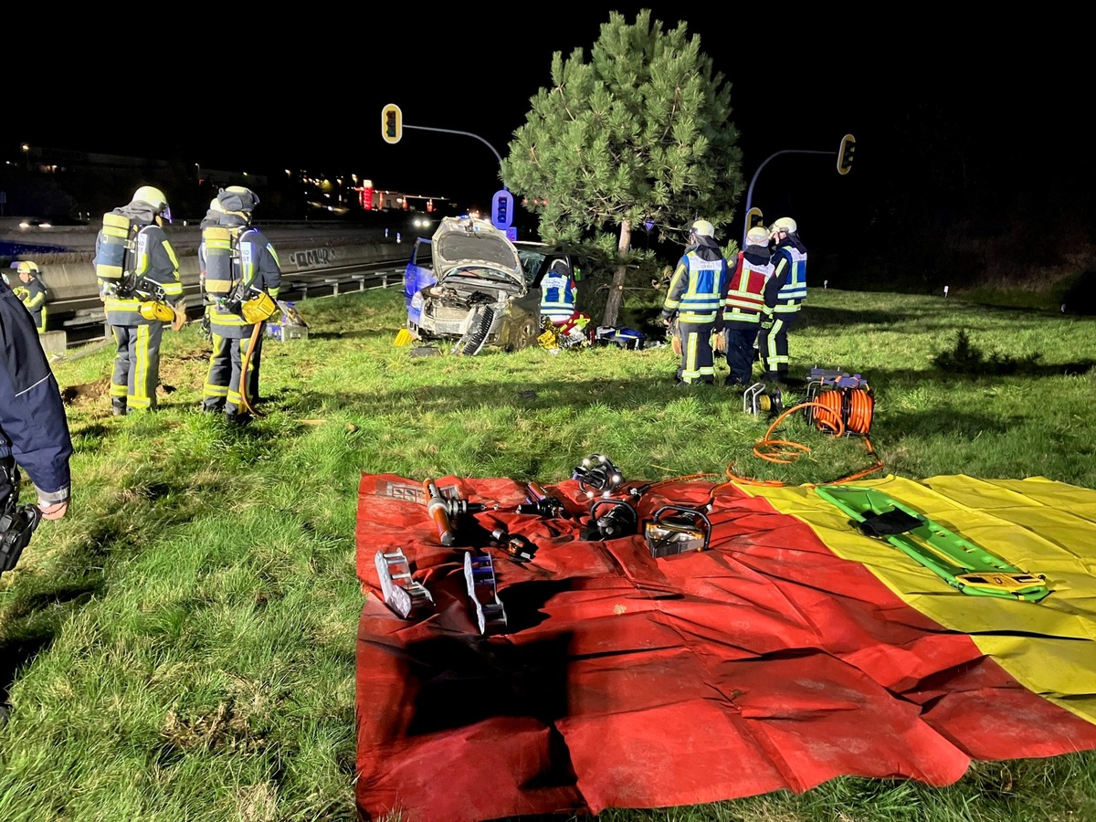 02.12.2024 - 07:59:32 | presseportal.deGegen 19:33 Uhr gingen gleich mehrere Anrufe bei der Leitstelle der Feuerwehr ein, die den Unfall an der Abfahrt Wattenscheider Kreuz meldeten. Aus noch unklaren Gründen durchfuhr der Fahrer mit seinem Pkw die Leitplanke und überschlug sich mehrfach auf dem Grünstreifen. Das Fahrzeug kam neben einen Baum auf einer Wiese zum Stehen. Als die Kräfte der Feuerwehr eintrafen, saß die Person noch sichtlich geschockt im Fahrzeug und konnte dieses nicht eigenständig verlassen. Es musste eine technische Rettung mit Spezialgeräten durchgeführt werden, um die Person sicher aus dem Fahrzeug zu retten. Während der Maßnahmen wurde durch den anwesenden Rettungsdienst eine medizinische Erstversorgung durchgeführt. Zur weiteren Behandlung wurde der schwer verletzte Patient in ein umliegendes Krankenhaus transportiert. Um 22:00 Uhr war der Einsatz der Feuerwehr beendet. Insgesamt waren 24 Einsatzkräfte der Berufsfeuerwehr vor Ort.