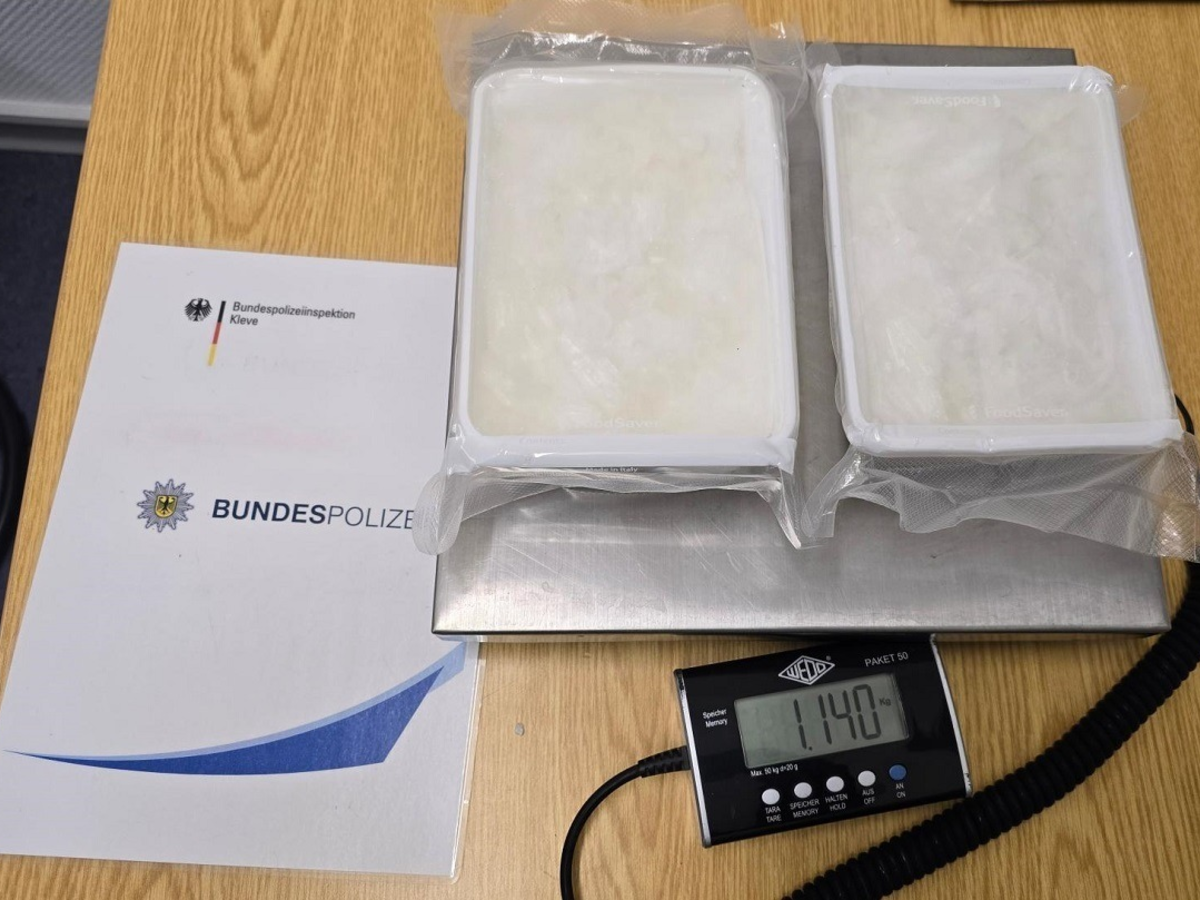 Kleve - Kranenburg - Bereits am Donnerstagnachmittag, 04. Dezember 2025, kontrollierte die Bundespolizei einen 23-jährigen Deutschen auf der Bundesstraße 9 in Kranenburg - Wyler. Die Überprüfung der Personalien verlief negativ. Jedoch wirkten die Angaben des Mannes unglaubwürdig und er verhielt sich zunehmend nervös. Bei einer anschließenden Durchsuchung des Kraftfahrzeugs stellten die Beamten zwei eingeschweißte weiße Pakete im Bereich der Rücksitzbank fest. Augenscheinlich handelte es sich hierbei um Methamphetamin. Der Reisende wurde vorläufig festgenommen und zur weiteren Sachverhaltsaufklärung zur Bundespolizeiinspektion nach Kleve gebracht. Eine Wiegung der Betäubungsmittel in der Dienststelle ergab ein Gesamtgewicht von 1140 Gramm. Zuständigkeitshalber übergab die Bundespolizei den Festgenommenen dem Zollfahndungsamt Essen, das die weiteren Ermittlungen übernimmt.