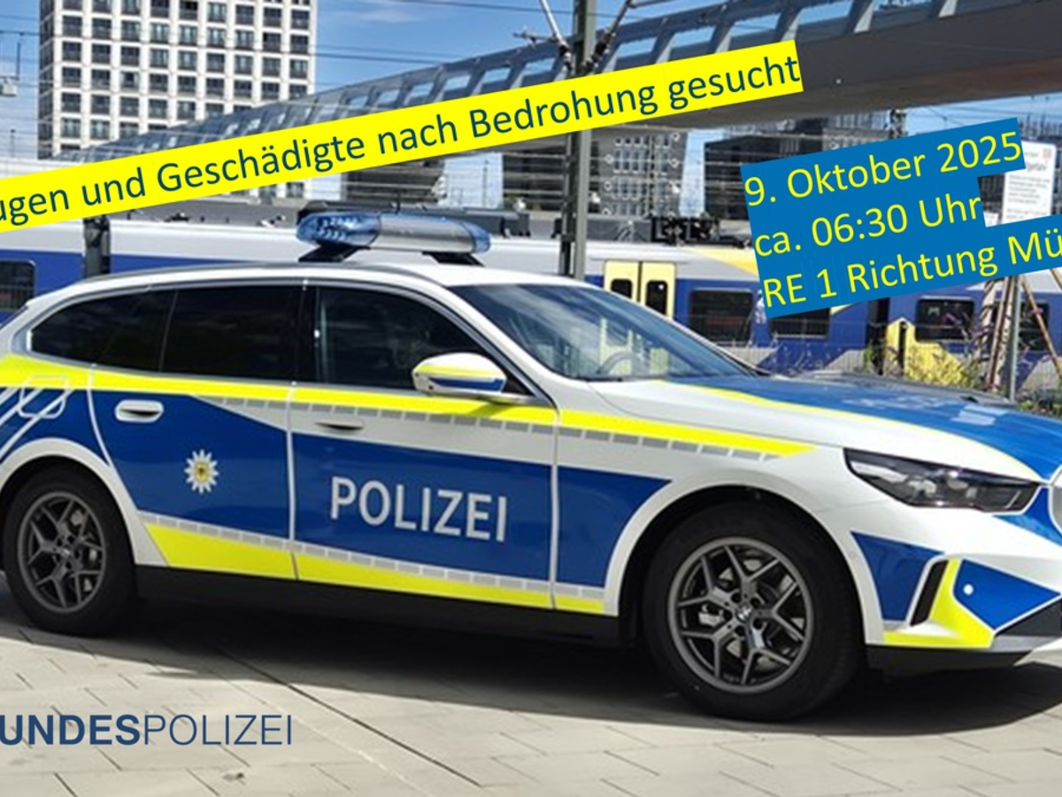 Die Bundespolizeiinspektion München bittet Fahrgäste, die am Donnerstagmorgen (9. Oktober) im Regionalexpress RE 1 (planmäßige Ankunft München Hbf 06:47 Uhr, tatsächliche Ankunft 07:05 Uhr) unterwegs waren und die Bedrohungen wahrgenommen haben oder selbst betroffen waren, sich zu melden. Hinweise bitte an die Bundespolizeiinspektion München, Tel. 089 / 515550 - 0.