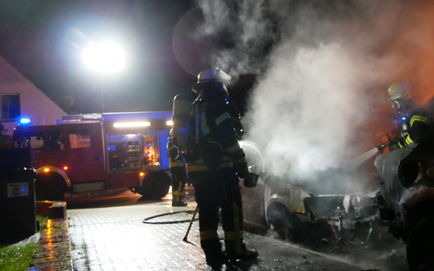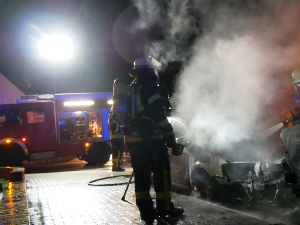 Zu einem PKW-Brand wurden die Einsatzkräfte dann um 00:50 Uhr in die Carstensstraße gerufen. Bei Eintreffen der Feuerwehr brannten zwei hintereinander abgestellte Fahrzeuge. Ein PKW brannte im Bereich des Motors, der zweite Wagen im Bereich des Hecks. Mit einem C-Rohr unter Atemschutz wurde der Brand gelöscht.