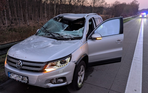 Infolge der Kollision bohrte sich der Stahlträger durch die Windschutzscheibe des Pkw, wodurch das Fahrzeugdach halbseitig aufgerissen wurde.