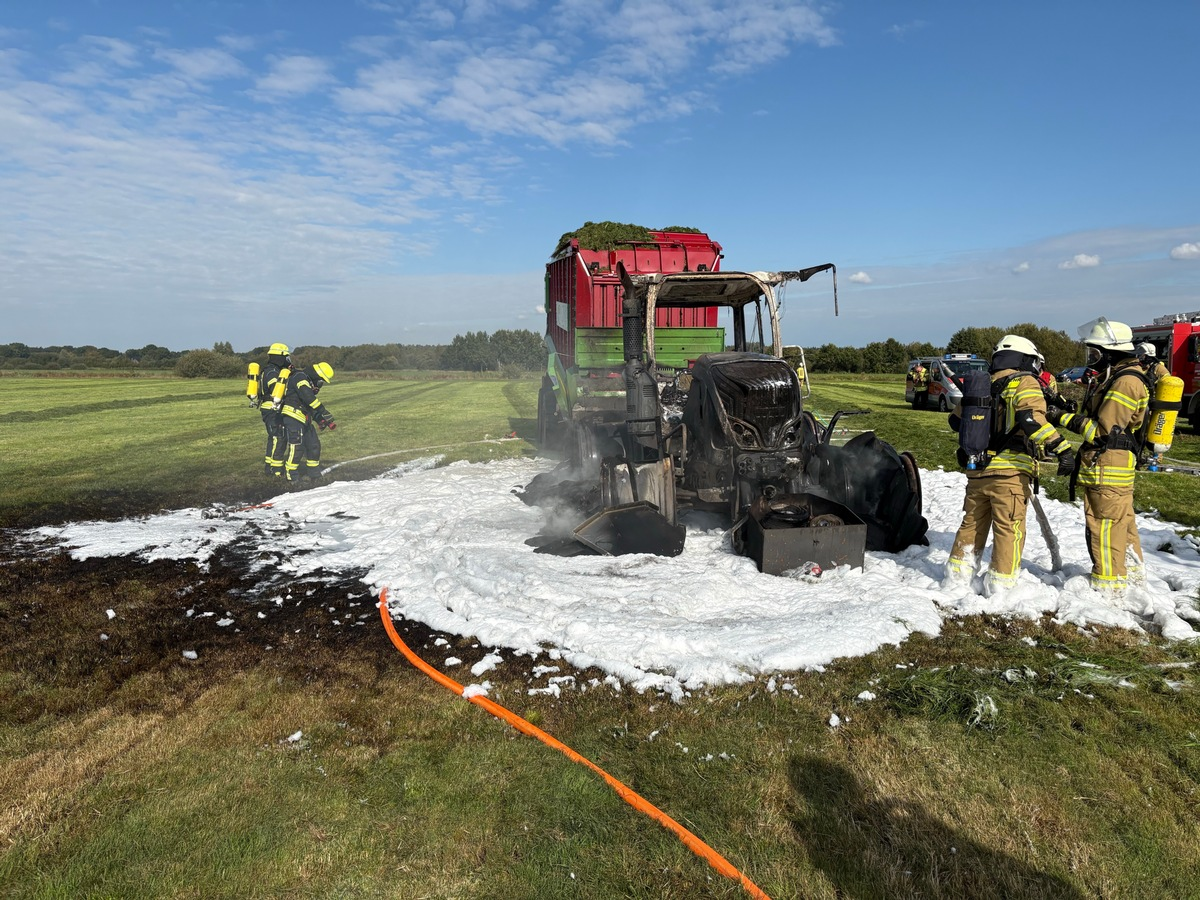 Cuxhaven - Loxstedt/ Düring. Am 30.09.2025 gegen 12:25 Uhr geriet bei Erntearbeiten ein hochwertiger Ackerschlepper in Brand. Durch die freiwilligen Feuerwehren der Gemeinde Loxstedt konnte eine Ausbreitung des Brandes auf den Anhänger und das umliegende Feld weitestgehend verhindert werden. Der Ackerschlepper brannte vollständig aus. Verletzte gab es zum Glück nicht.