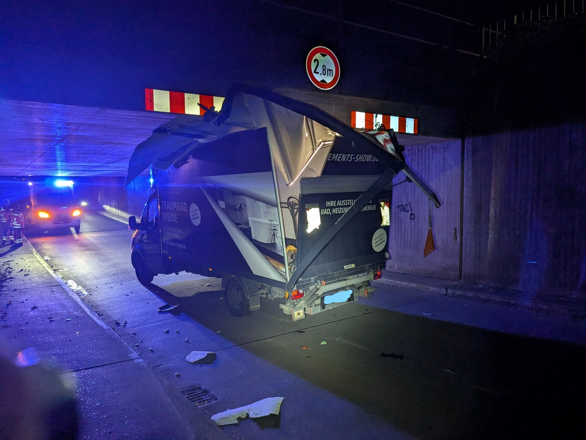 Am frühen Dienstagmorgen gegen 05.20 Uhr war es mal wieder soweit. An der Bahnunterführung in der Kampstraße missachtete ein 27-jähriger Fahrer eines Transporters die Höhenbegrenzung und blieb mit seinem Fahrzeug unter der Bahnunterführung stecken. Der Fahrer des VW-Transporters mit einem hohen Aufbau fuhr gegen die Unterführung und blieb unter ihr stecken. Am Fahrzeug, insbesondere am Aufbau, entstand Sachschaden. Der 27-jährige Fahrer erlitt leichte Verletzungen, wurde vom Rettungsdienst versorgt und anschließend in ein Krankenhaus gebracht.