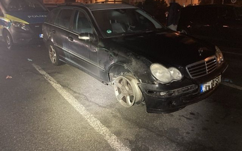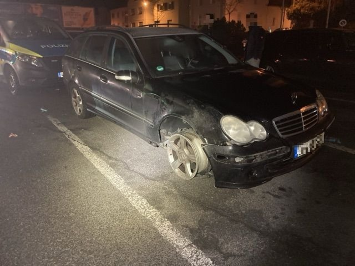 Die eingesetzten Streifen fanden die C-Klasse kurz darauf auf dem Parkplatz eines Supermarktes in der Rathenaustraße; am vorderen rechten Rad des Wagens fehlte der komplette Reifen und im Innenraum lagen Bier- und Weinflachen. Den Reifen muss er infolge des Unfalls während Fahrt verloren haben, so die Vermutung der Ordnungshüter. Der 65-jährige mutmaßliche Fahrer war danach ausgestiegen und zu Fuß weitergelaufen, konnte jedoch wenige Augenblicke später durch die Polizisten geschnappt werden. Ein Atemalkoholtest ergab einen Wert von über 0,9 Promille, weswegen nicht nur eine Blutentnahme und die Sicherstellung seines Führerscheins folgten, sondern auch die Einleitung eines Strafverfahrens wegen Verdachts der Straßenverkehrsgefährdung.