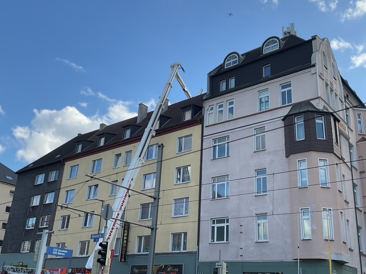 01.03.2026 - 16:58:43 | presseportal.deDie Feuerwehr Dortmund wurde kurz nach 13 Uhr zu einem Brand in ein mehrgeschossiges Gebäude in der Rheinischen Straße alarmiert. Bereits auf der Anfahrt war eine Rauchentwicklung erkennbar. Durch den ersteintreffenden Löschzug konnte schnell ein Feuer in einer Absauganlage eines Restaurants im Erdgeschoss ausgemacht werden. Zusätzlich war die Dachkonstruktion des Erdgeschosses im hinteren Gebäudeteil betroffen, da der Kamin hier in Höhe des ersten Obergeschosses aus dem Gebäude geführt wurde und bis zum eigentlichen Dach außen an der Fassade verlief. Aufgrund der komplexen und zunächst nicht vollständig übersichtlichen Lage wurde ein weiterer Löschzug sowie Spezialkräfte der Feuerwehr zur Einsatzstelle entsandt. Da das Ladenlokal bereits geräumt war und es keine verletzten Personen zu beklagen gab, konnten sich die Feuerwehrkräfte auf die Brandbekämpfung konzentrieren. Im Restaurant war das Feuer schnell unter Kontrolle. Die betroffene Dachkonstruktion wurde geöffnet und auf Glutnester abgesucht. Zur Umfassenden Erkundung des gesamten Gebäudes kamen dabei auch der Teleskopmast 54 sowie die Drohne des Fernmeldezugs zum Einsatz. Der Schaden konnte auf die Absauganlage sowie einen kleinen Teil der Dachkonstruktion begrenzt gehalten werden. Die verrauchten Bereiche wurden mit Hochleistungslüftern entraucht. Wohnungen oder Nachbargebäude waren nicht betroffen. Die Ursache des Brandes wird von der Krimimalpolizei ermittelt. Für die Dauer des Einsatzes war die Rheinische Straße in Richtung Innenstadt gesperrt. Ebenfalls waren die Stadtbahnlinien U43 und U44 gesperrt.