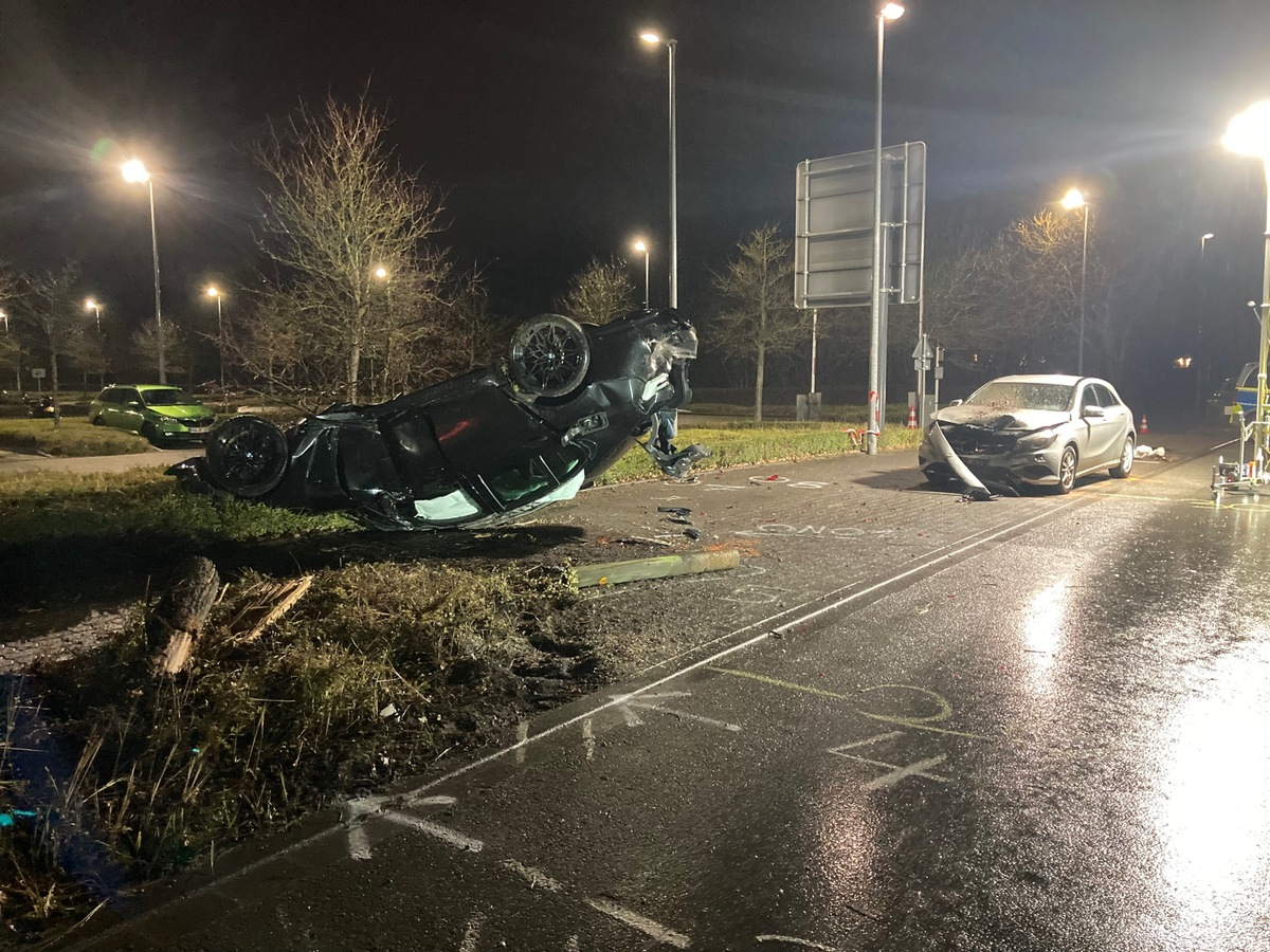 12.01.2026 - 08:13:03 | presseportal.deEin 25-jähriger Mann aus Anröchte fuhr gegen 17:15 Uhr mit einem BMW M3 Competition auf der Hansastraße in Fahrtrichtung Bremer Straße. Laut Zeugenaussagen beschleunigte das Fahrzeug sehr stark und geriet daraufhin ins Schleudern. Der hochmotorisierte BMW kollidierte mit einem Baum und einer am Fahrbahnrand geparkten Mercedes A-Klasse und landete schließlich auf dem Dach.