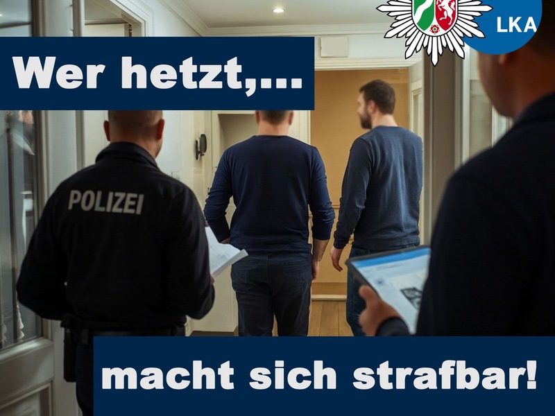 Die Polizei NRW setzt mit der Aktion ein Zeichen. Es ist wichtig, Hetzer und andere Straftäter aus der vermeintlich schützenden Anonymität des Internets herauszuholen und sie die Konsequenzen ihres Tuns spüren zu lassen. Hasspostings treffen häufig Menschen, die sich ehrenamtlich, politisch oder gesellschaftlich engagieren. Diese Taten müssen ernst genommen werden - online wie offline. Wer strafbare Inhalte postet, teilt oder unterstützt, muss mit Ermittlungen und polizeilichen Maßnahmen rechnen.
