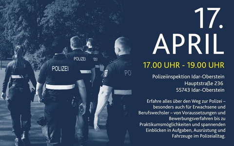Die Polizeiinspektionen Birkenfeld und Idar-Oberstein laden am 17. April ab 17 Uhr gemeinsam zu einem Berufsinformationsabend der besonderen Art ein. Die Veranstaltung findet in den Räumlichkeiten der Polizeiinspektion Idar-Oberstein statt.