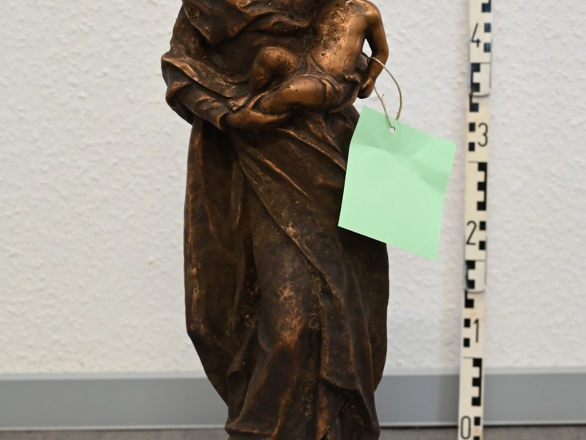 Emmerich am Rhein - Am Samstag (25. Oktober 2025) meldeten sich mehrere Kinder auf der Polizeiwache Emmerich und teilten mit, dass in einem Waldstück am Diepe Kuhweg in Emmerich eine schwere Bronzefigur liegen würde. Diese wurde anschließend durch Polizeibeamte aufgefunden und sichergestellt. Die Figur lag möglicherweise schon mehrere Monate dort. Die bisherigen Ermittlungen der Kriminalpolizei in Emmerich führten bisher nicht dazu, dass die Herkunft ermittelt werden konnte. Auch ist nicht bekannt, ob es sich bei der etwa 60 cm großen Frauenfigur, die ein kleines Kind in den Armen hält, um einen sakralen Gegenstand aus einer Kirche (eventuell eine Darstellung von Maria mit dem Jesuskind), Grabschmuck oder einen sonstigen, profanen Gegenstand handelt. Daher bittet die Polizei um Hinweise von Zeugen, die Angaben zur Herkunft der Figur machen können. Hinweise bitte unter Telefon 02822 7830. (sp)