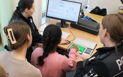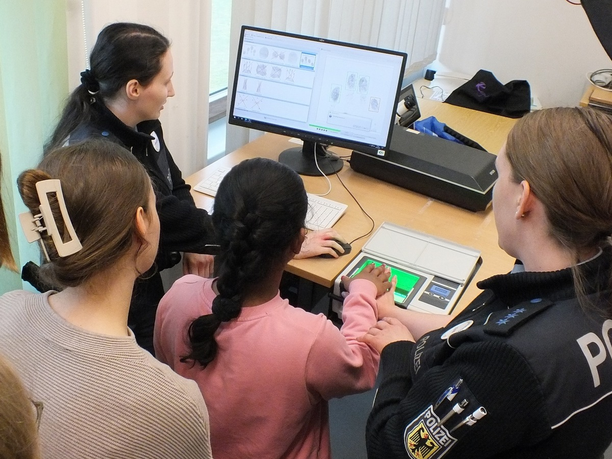 25.04.2024 - 15:00:33 | presseportal.deNach kurzer Einweisung über die grenz- und bahnpolizeiliche Aufgaben der Bundespolizei wurde die erkennungsdienstliche Behandlung wie man Fingerabdrücke von polizeipflichtigen Personen nimmt, gezeigt. Hier durften die Mädchen "selbst Hand anlegen".(siehe Bild)