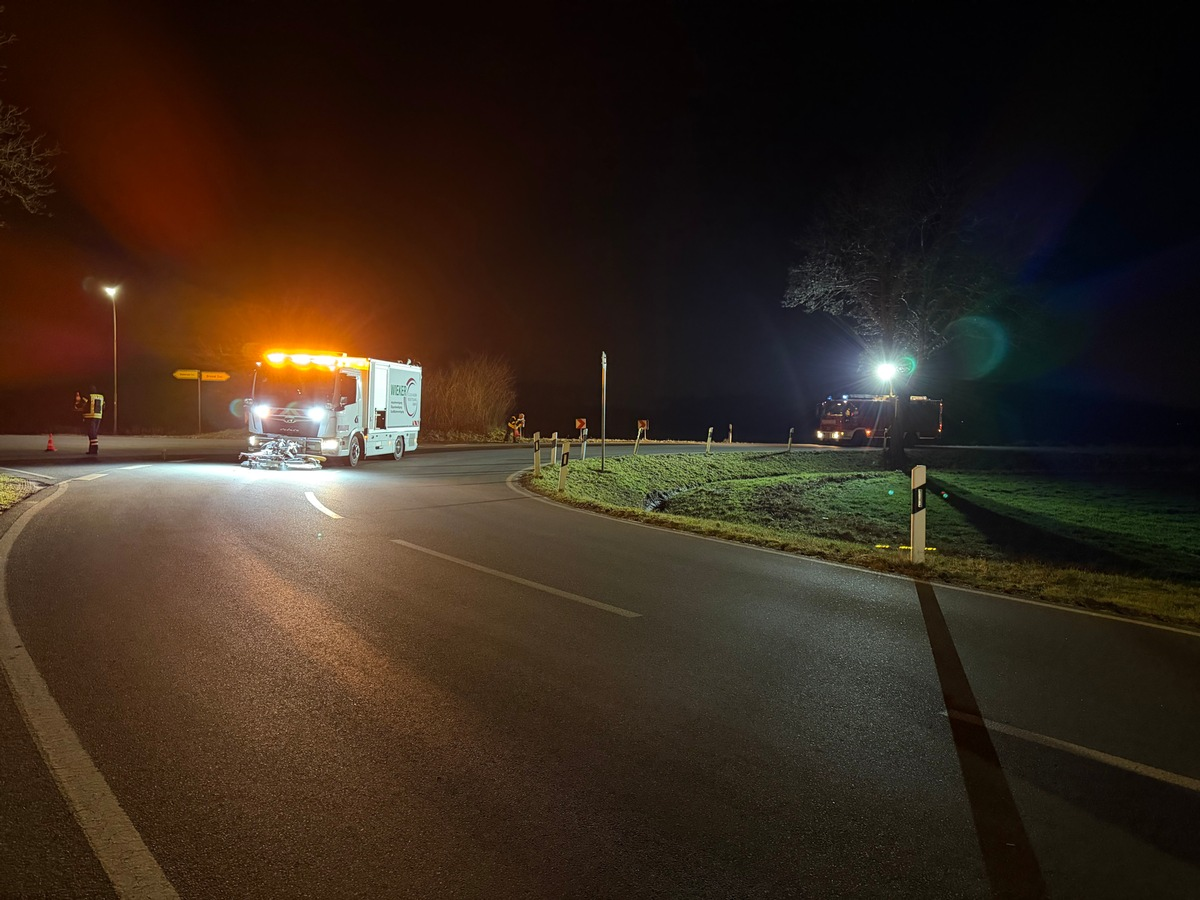 Ein Spezialfahrzeug zur Fahrbahnreinigung musste aus Bergen anfahren und übernahm anschließend die gründliche Reinigung der betroffenen Strecke. Die Feuerwehr blieb bis zum Abschluss der Maßnahmen an der Einsatzstelle. Nach knapp vier Stunden konnte der Einsatz für die Ortsfeuerwehr Wiedenrode beendet werden.
