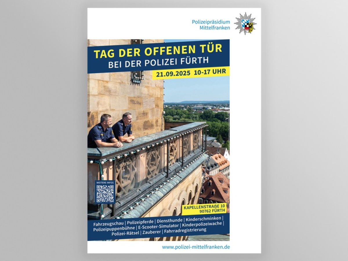15.09.2025 - 11:29:53 | presseportal.deVon 10:00 Uhr bis 17:00 Uhr bieten die Polizeiinspektion, die Verkehrspolizei sowie die Kriminalpolizei in der Kapellenstraße 10, 90762 Fürth, ihren Besuchern ein interessantes und unterhaltsames Programm an.