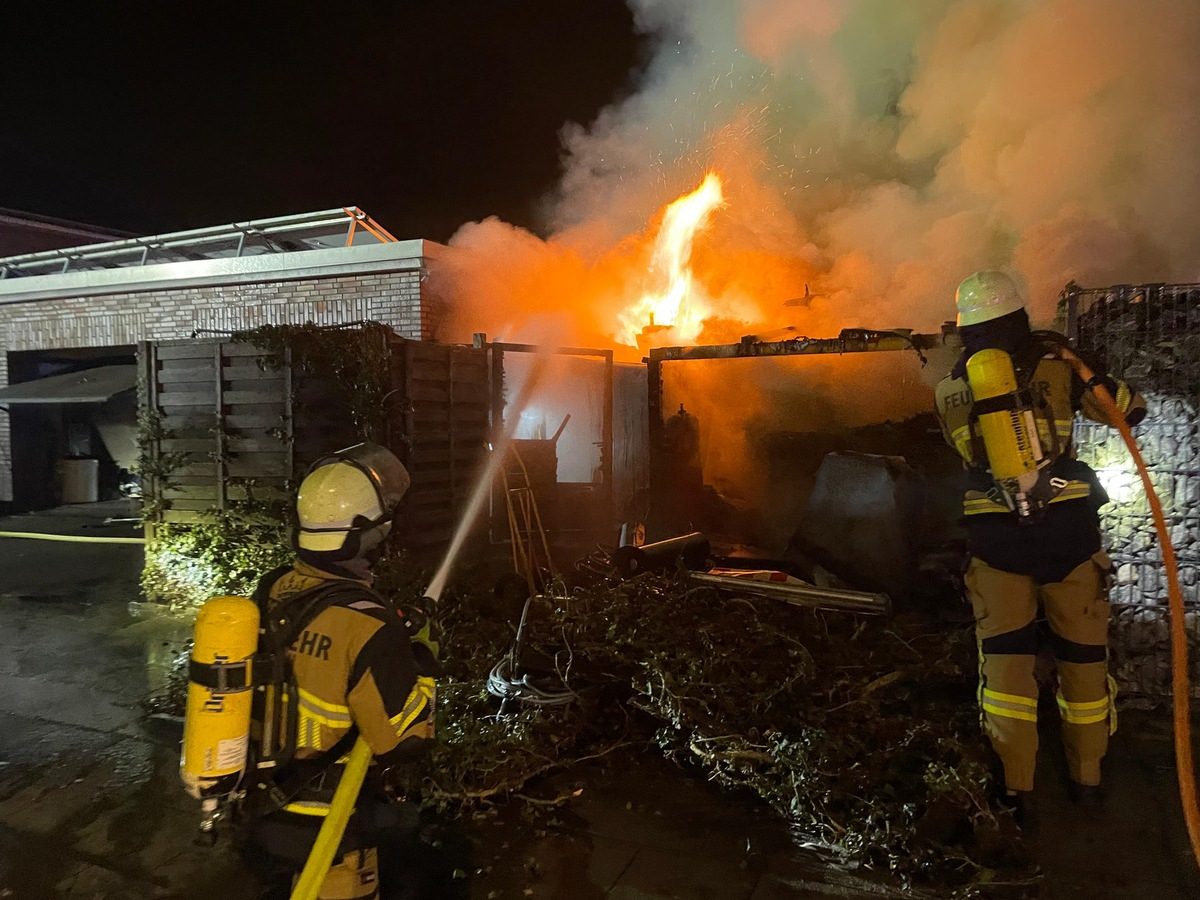 FW-E: Brand eines Gartenhauses - Gasflaschen sorgen für besondere Gefahr