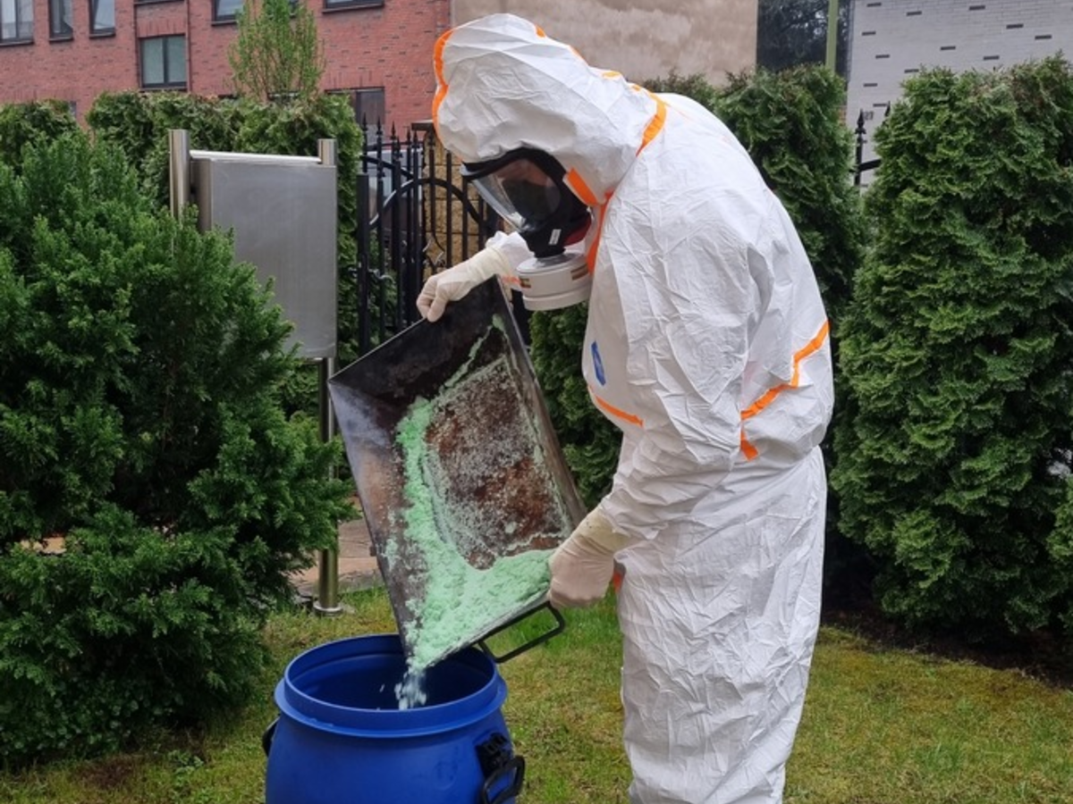 Bei der ersten Erkundung stellten die Kräfte im Treppenraum eines Mehrfamilienhauses eine gelb-rötliche, unbekannte Flüssigkeit fest. Um welchen Stoff es sich dabei handelte, war zunächst nicht erkennbar. Der beißende Geruch war nasal deutlich festzustellen.