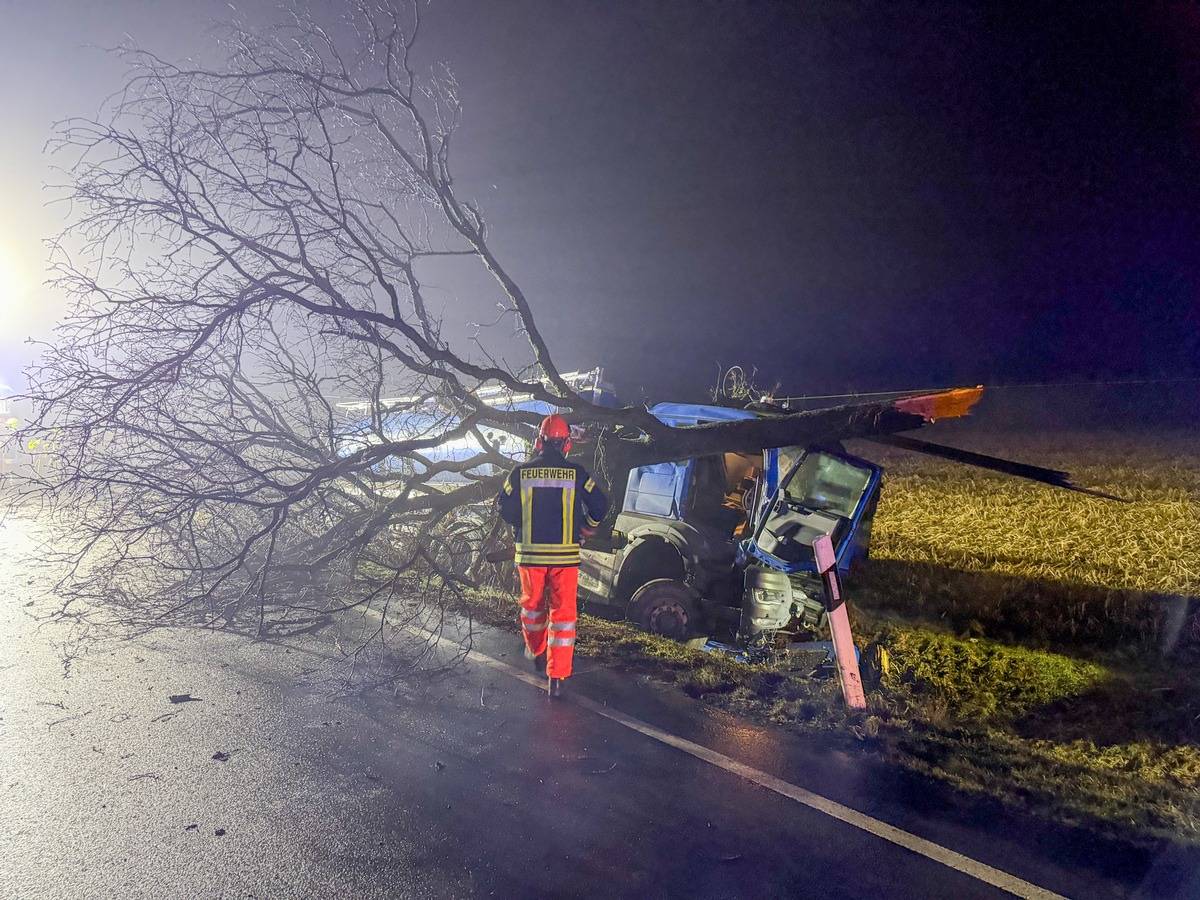 FW Flotwedel: LKW kommt von Fahrbahn ab - Baum blockiert B214