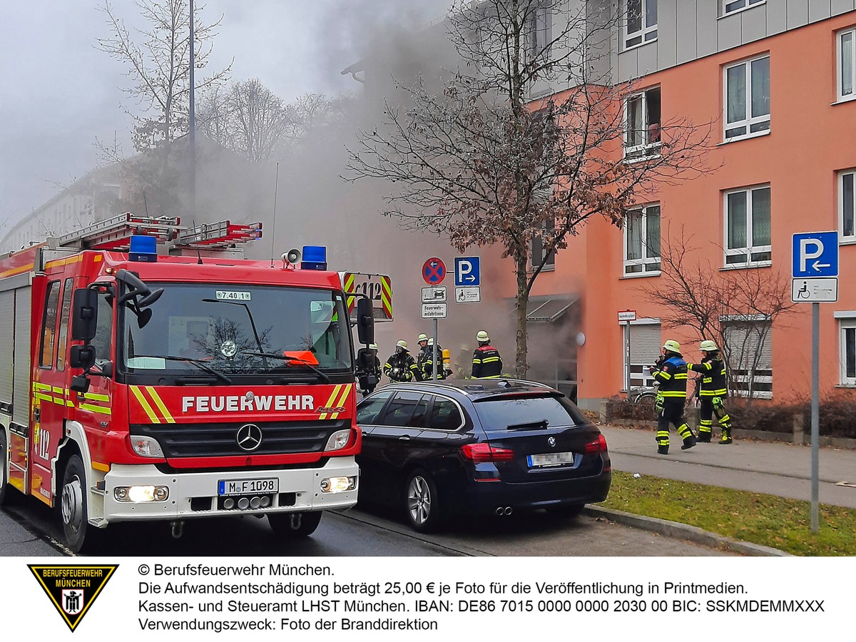 Einsatzkräfte der Feuerwehr München und des Rettungsdienstes wurden zu der Einsatzadresse disponiert. Bereist auf dem Weg zum Einsatzort konnten sie die Rauchentwicklung sehen.