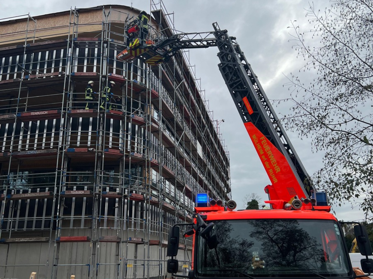 Mülheim an der Ruhr - Am Dienstagvormittag, 2. Dezember 2025, kam es auf einer Baustelle auf einem Firmengelände im Stadtteil Mülheim-Saarn zu einem Arbeitsunfall. Die Leitstelle alarmierte daraufhin einen Rettungswagen des Deutschen Roten Kreuzes zur Einsatzstelle. Ein männlicher Bauarbeiter hatte sich eine tiefere Schnittverletzung im Bereich der Wade zugezogen. Da sich der Verletzte im Obergeschoss auf einem Baugerüst befand und aufgrund seiner Verletzung nicht mehr gehfähig war, wurden zur Unterstützung des Rettungsdienstes weitere Einsatzkräfte nachalarmiert. Neben dem Notarzteinsatzfahrzeug waren der Führungsdienst, ein Hilfeleistungslöschfahrzeug sowie die Drehleiter der Feuerwache 1 vor Ort. Nachdem der Arbeiter durch den Rettungsdienst und den Notarzt erstversorgt worden war, wurde er in einer Schleifkorbtrage gesichert und mithilfe der Drehleiter schonend zu Boden gebracht. Anschließend erfolgte der Transport in ein Krankenhaus nach Duisburg. Die Polizei hat die Ermittlungen zum Arbeitsunfall aufgenommen. (DR)