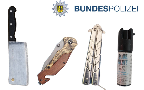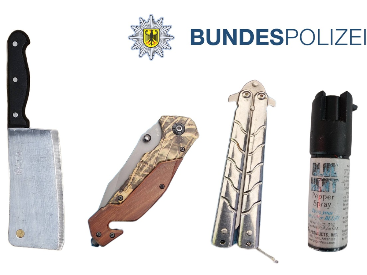 Am Sonntag, gegen 9:00 Uhr, kontrollierten Bundespolizisten zwei weitere polnische Staatsangehörige. Bei der Kontrolle wurden unter anderem ein Butterflymesser sowie ein Reizstoffsprühgerät ohne die erforderliche Kennzeichnung aufgefunden. Gegen beide Männer wurde ein Strafverfahren wegen Verstoßes gegen das Waffengesetz eingeleitet. Die Gegenstände wurden sichergestellt.
