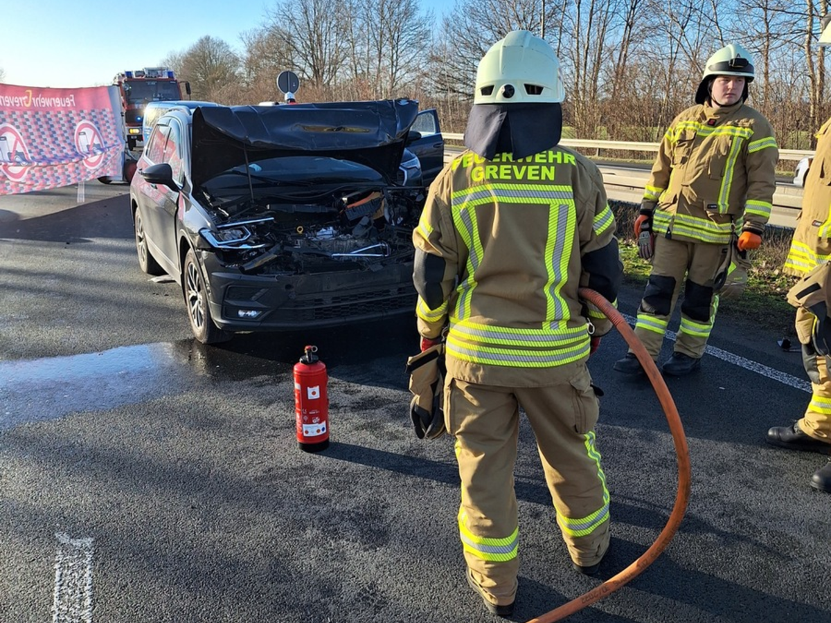 FW-Greven: Schwerer Verkehrsunfall auf der A1 mit fünf verletzten Personen.