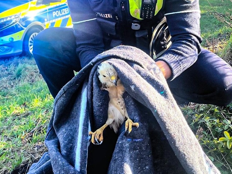 Die Greifvogelstation informierte gegen 13:50 Uhr die Polizei. Zwei Kollegen der Wache Nord in Wesel fuhren zum gemeldeten Fundort des Tieres. Mit einer Decke konnte der Mäusebussard eingefangen und an die Greifvogelstation in Wesel übergeben werden.